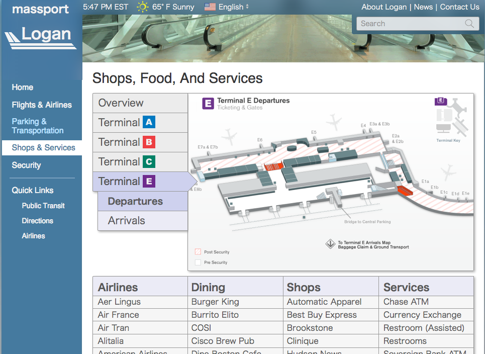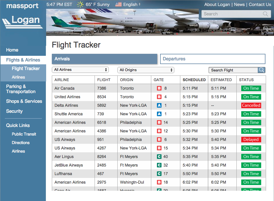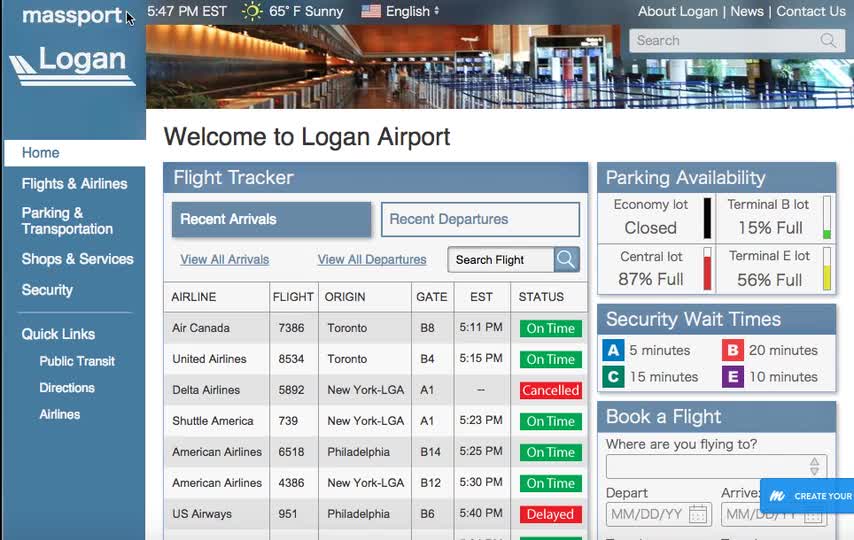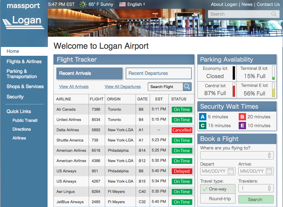 The flight tracker has clear big buttons for arrivals versus departures. The status of each flight is clearly labeled with color coded “On time” “Delayed” and “Canceled”. On the right there are meters for the status of the parking garages, TSA wait times and the opportunity to book a flight. These were the top features that users look for in an airport website.