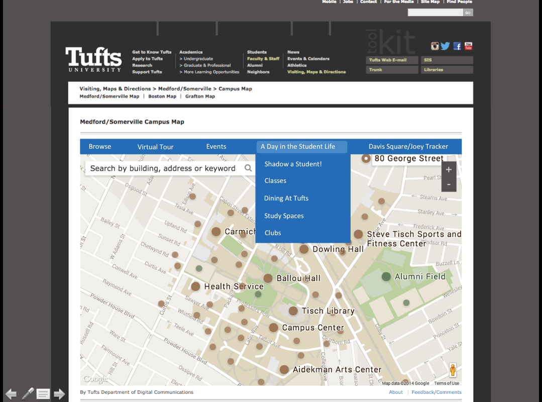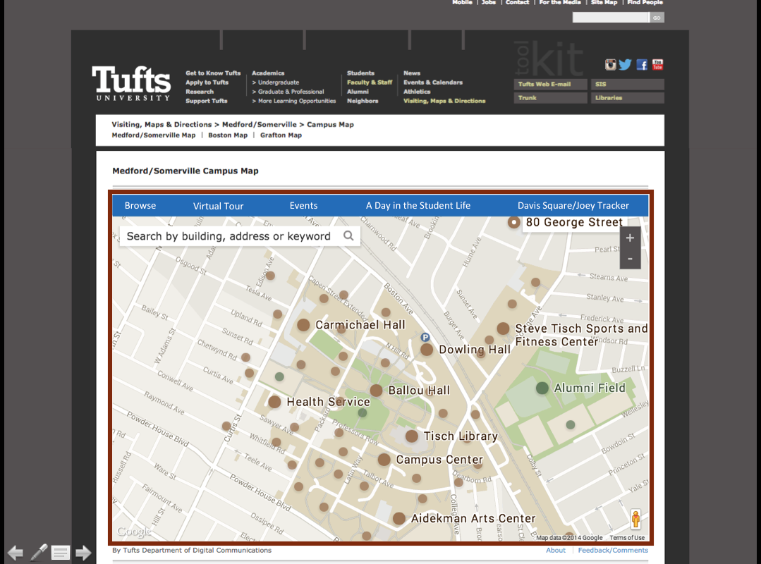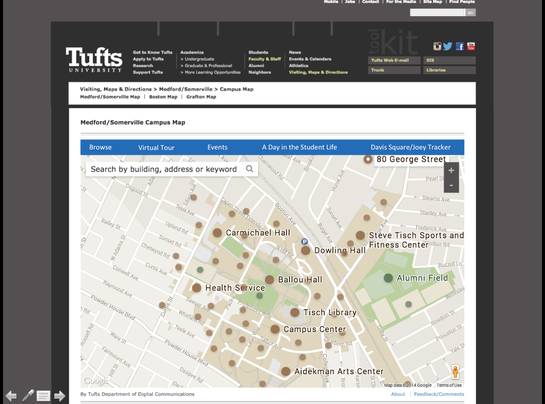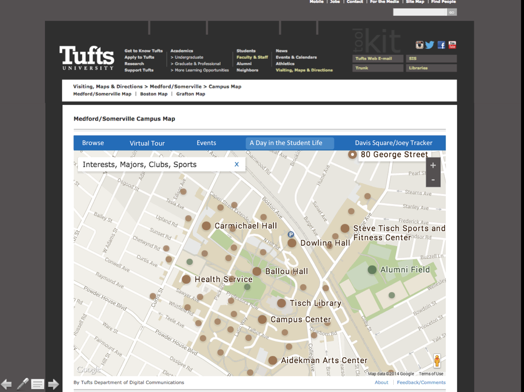 The current interactive Tufts Map on their website. The website does not currently have the capability to give a tour to a student when they are on campus or provide helpful information for a daily visit. This is an existing website