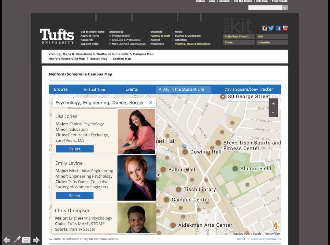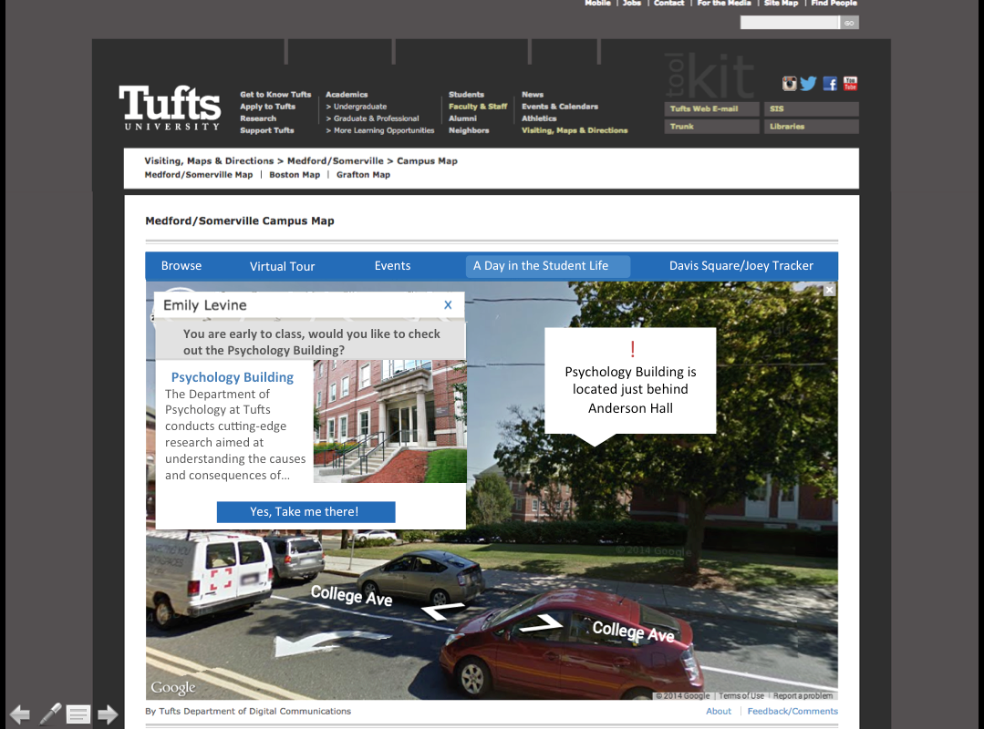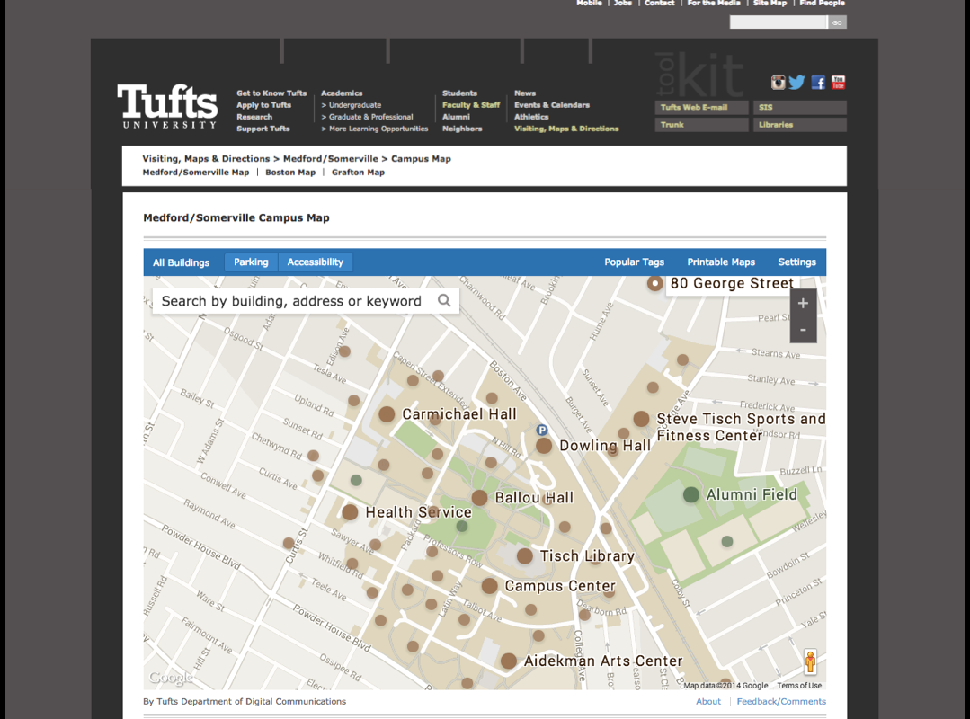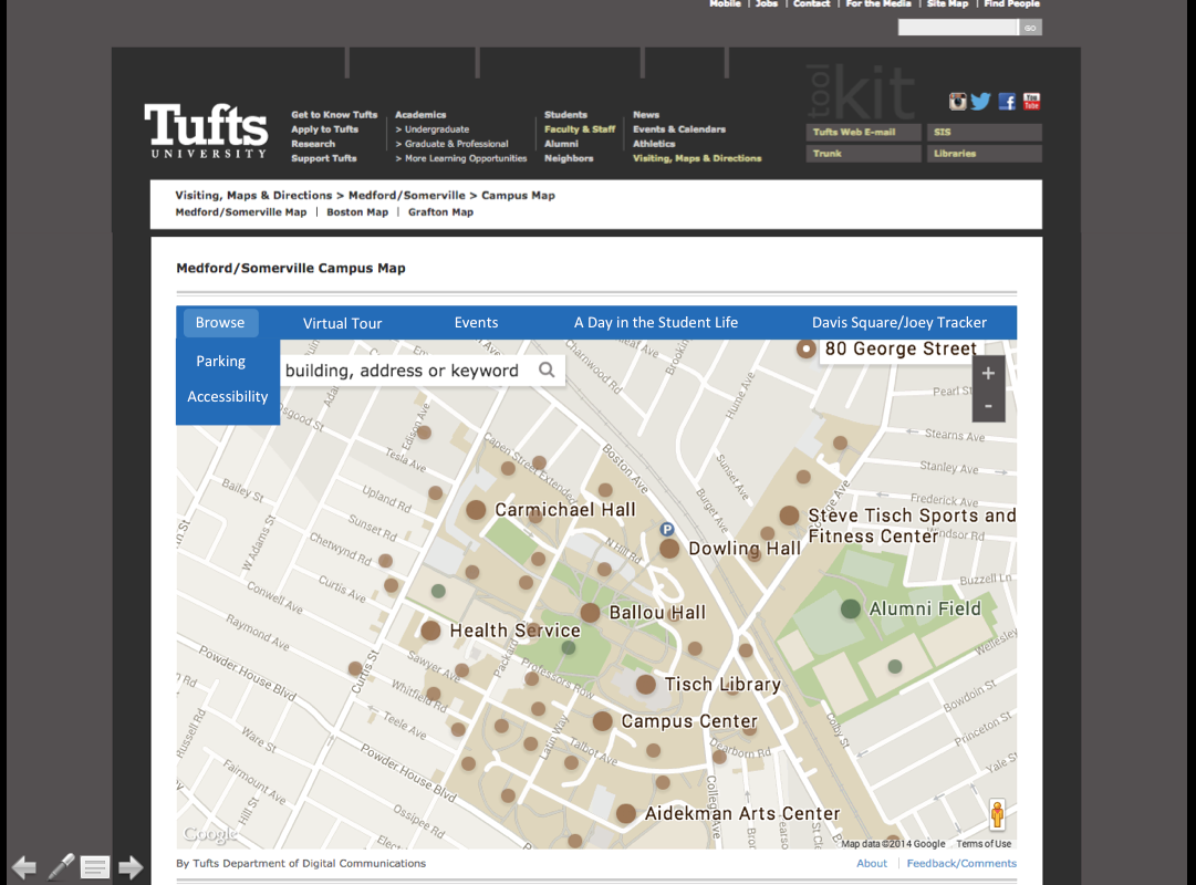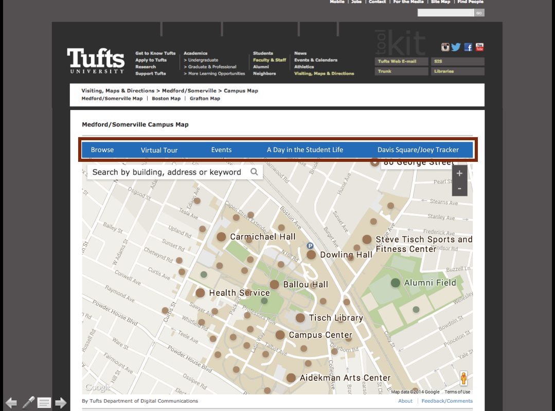 The current interactive Tufts Map on their website. The website does not currently have the capability to give a tour to a student when they are on campus or provide helpful information for a daily visit. This is an existing website