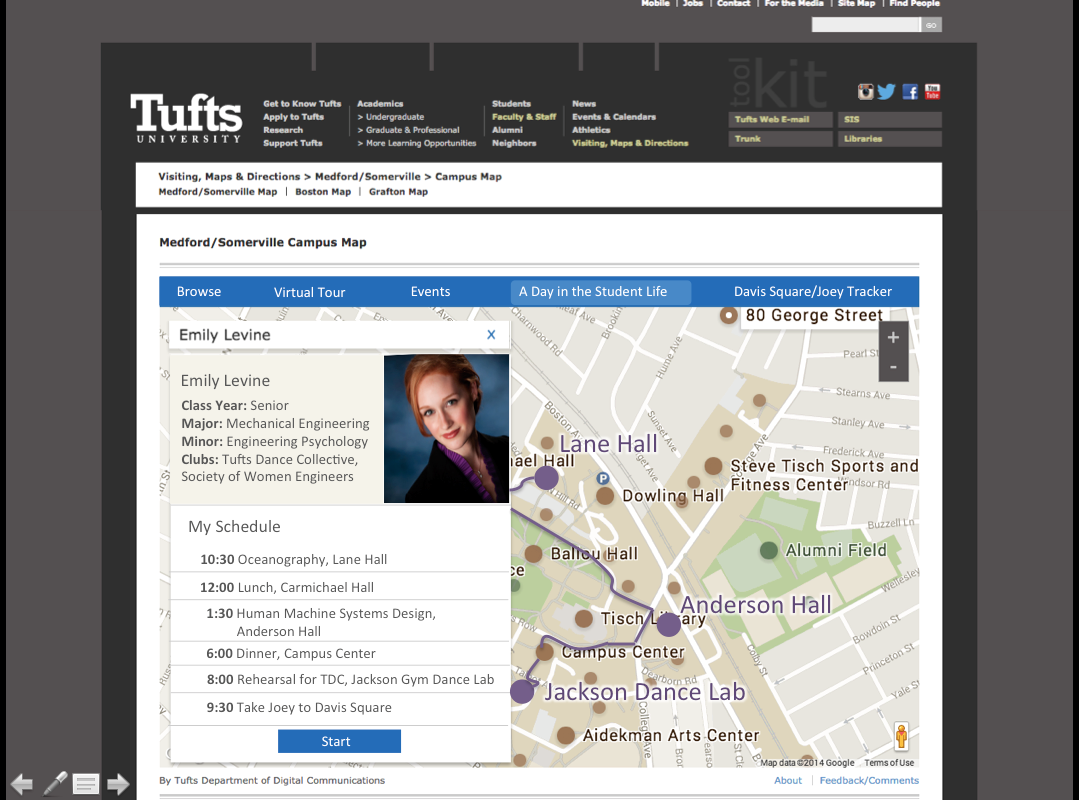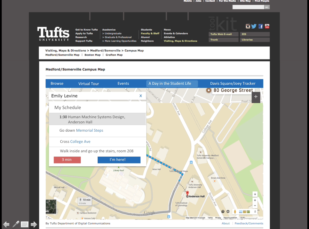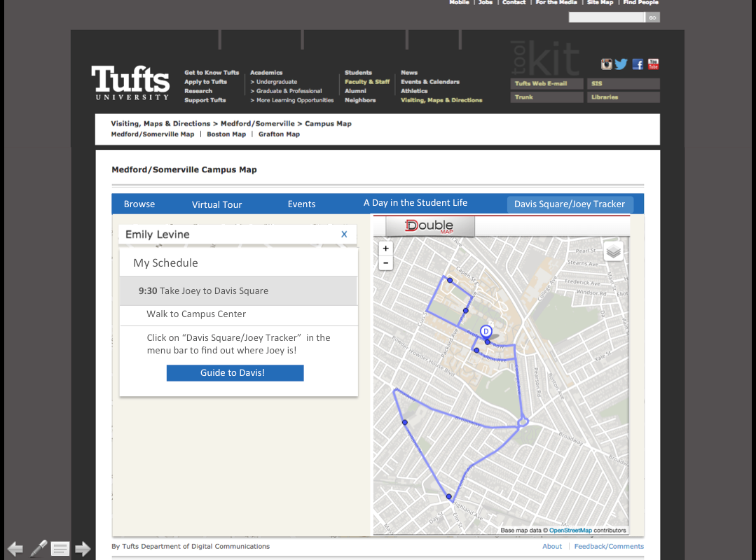 This highlighted function allows a prospective student plan their day at Tufts as if they were a current Tufts student. The details of this function is the scope of my project.